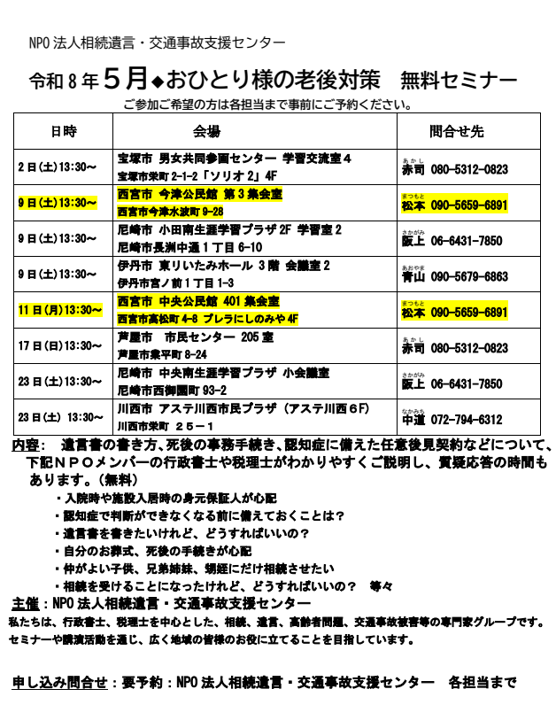 おひとり様の老後対策セミナー開催一覧(5月)